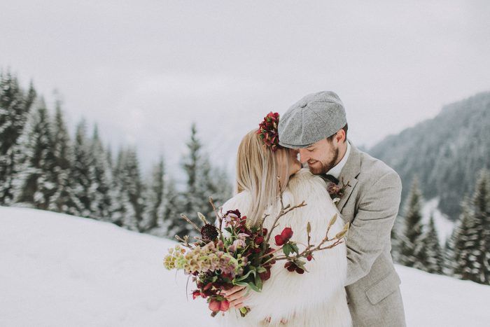 Если снежная зима в твоих краях бывает не каждый год, тогда снимите с женихом домик в горах — устройте себе «медовые выходные» и свадебную фотосессию.