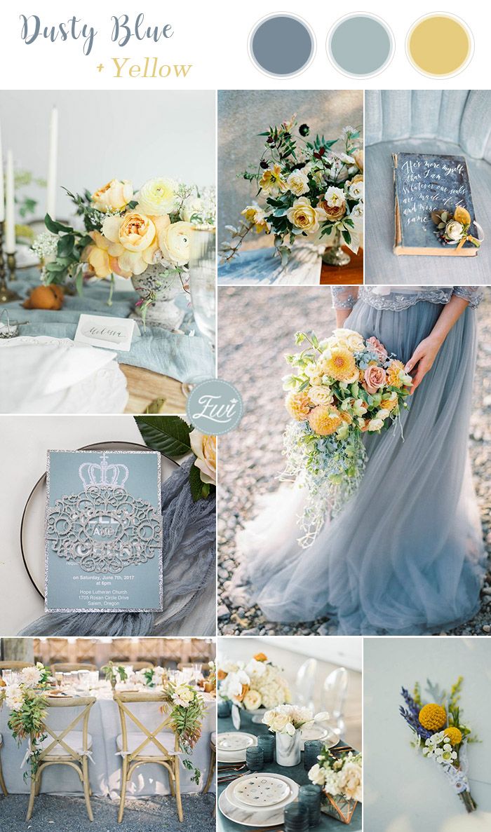 Пыльно-синий и желтый. Красивая, изящная и в то же время достаточно яркая цветовая палитра. Идеальное решение для летней свадьбы в 2019 году.