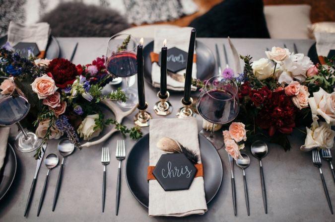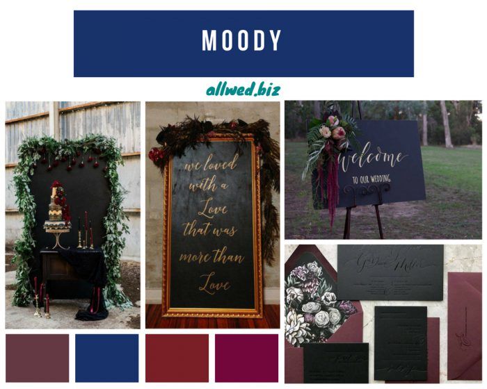 Если ты любишь что-то необычное, тебе может понравится тренд, только набирающий обороты в свадебной индустрии, — moody. Это свадьба в темных тонах (бургундия, марсала, темно-красный, темно-синий, сливовый).