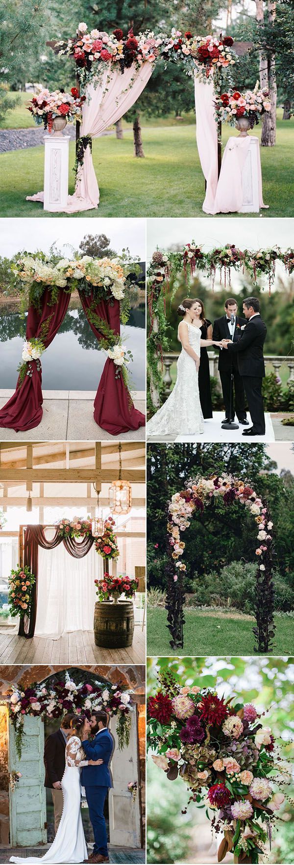 Весільна арка. Для оформлення місця церемонії ти можеш обрати безпрограшний варіант — драпірування світлою тканиною і квіткові композиції з бордовими нотками. Втым, не менше красиво і дуже цікаво виглядає поєднання білої арки і бордового драпірування (особливо актуально зараз використання оксамиту).