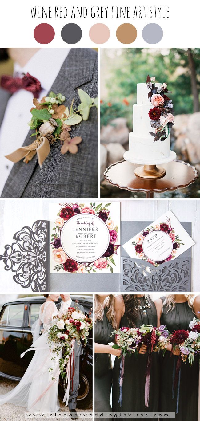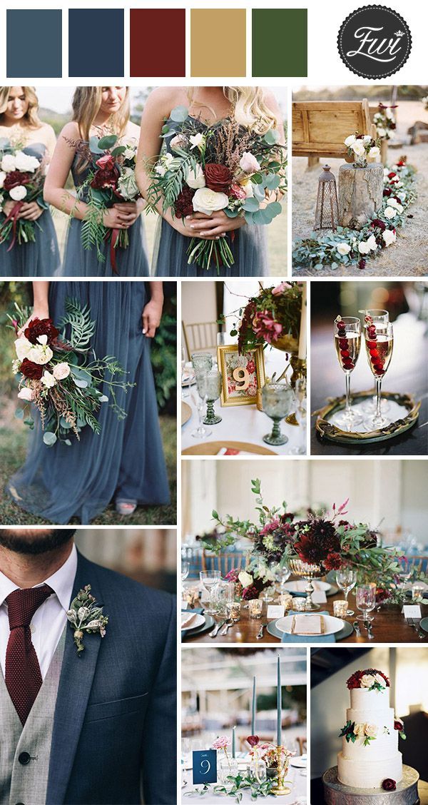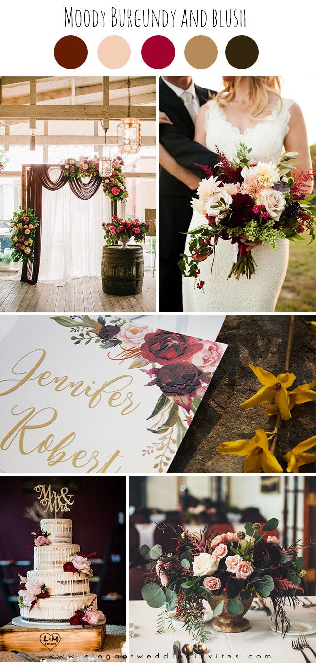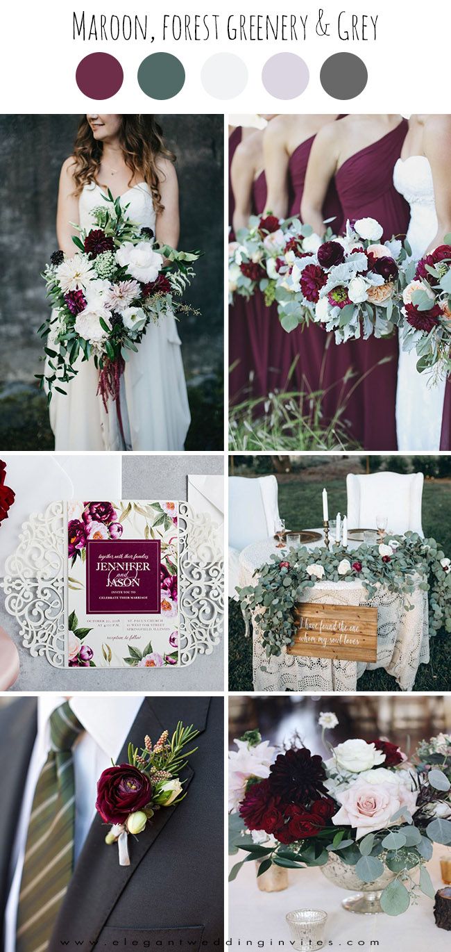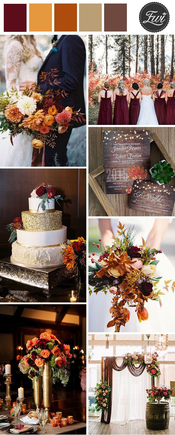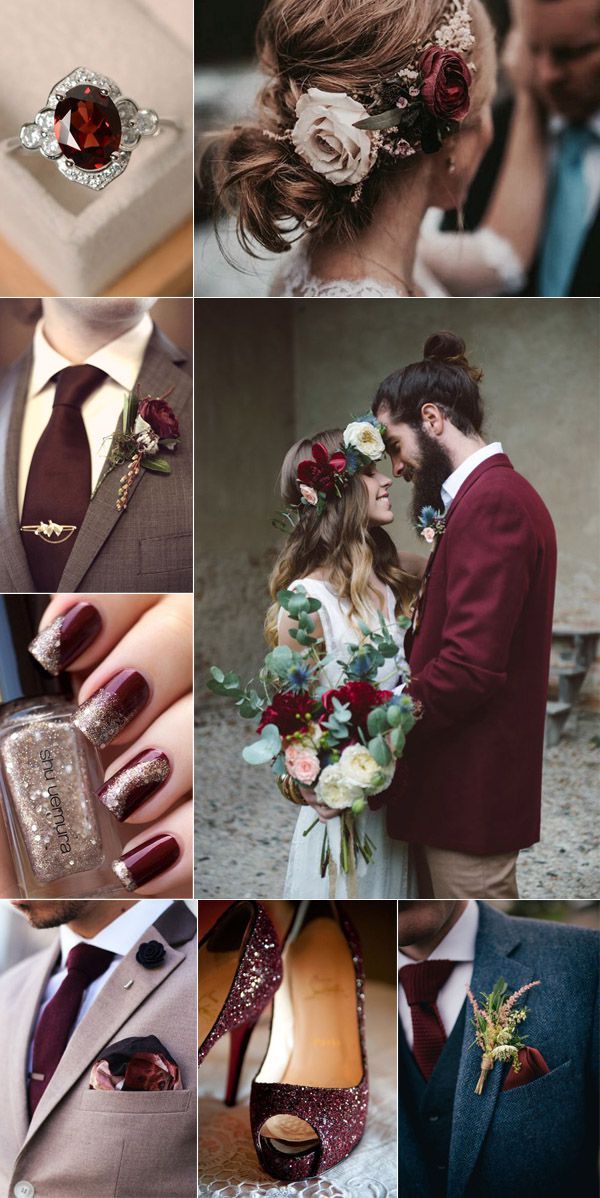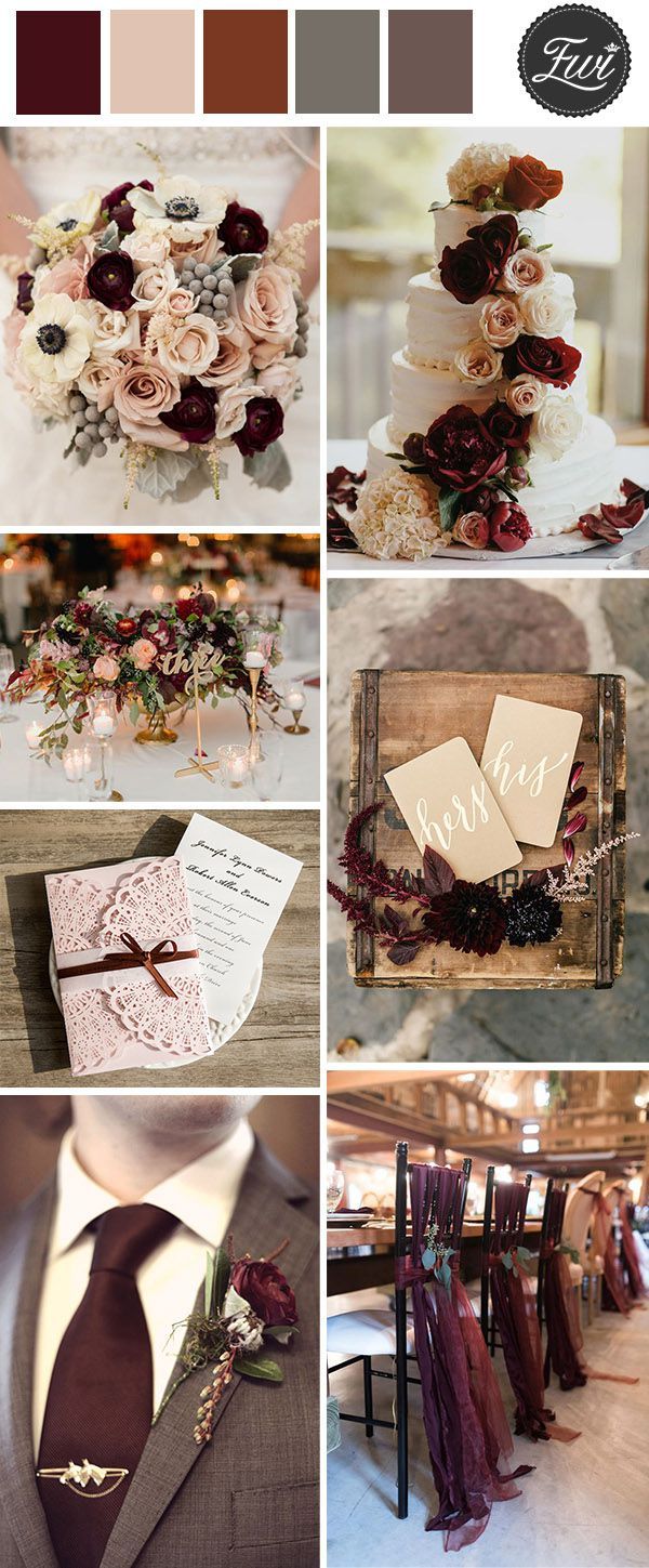 Палітри з бордовим кольором. Золото, помаранчевий колір, відтінки коричневого, сіро-зелений, запорошений рожевий і багато інших відтінків прекрасно поєднуються з бордовим. Все залежить від ваших уподобань і атмосфери, яку ви хочете створити на своєму весіллі — ніжну або урочисту, просту душевну або розкішну.