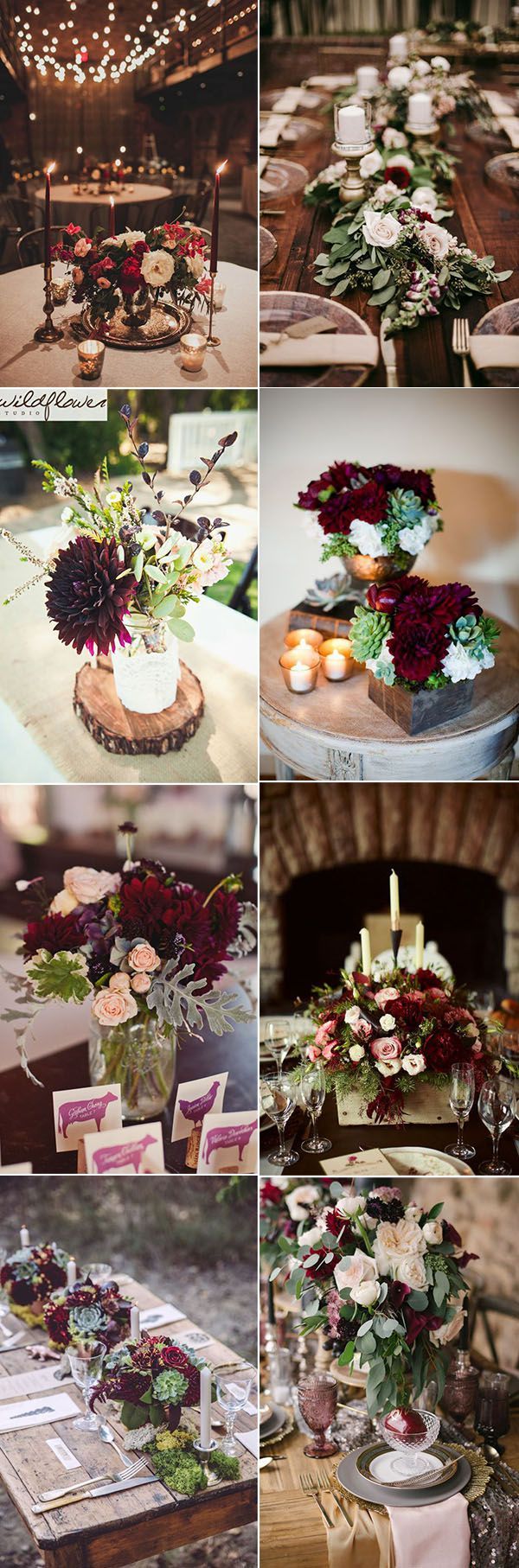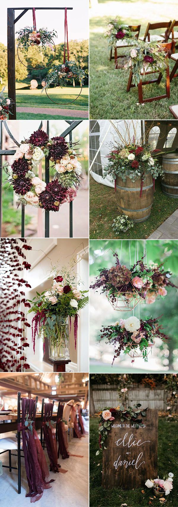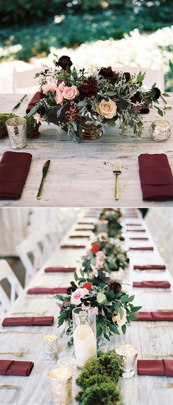 Весільний декор. В оформленні весілля бордовий колір потрібно використовувати в правильній пропорції, оскільки він досить насичений і темний. Він буде добре виглядати в якості акцентів на світлому фоні. Також зробити більш легким і свіжим бордовий колір допоможуть зелений, золотий, сірий колір або колір слонової кістки.