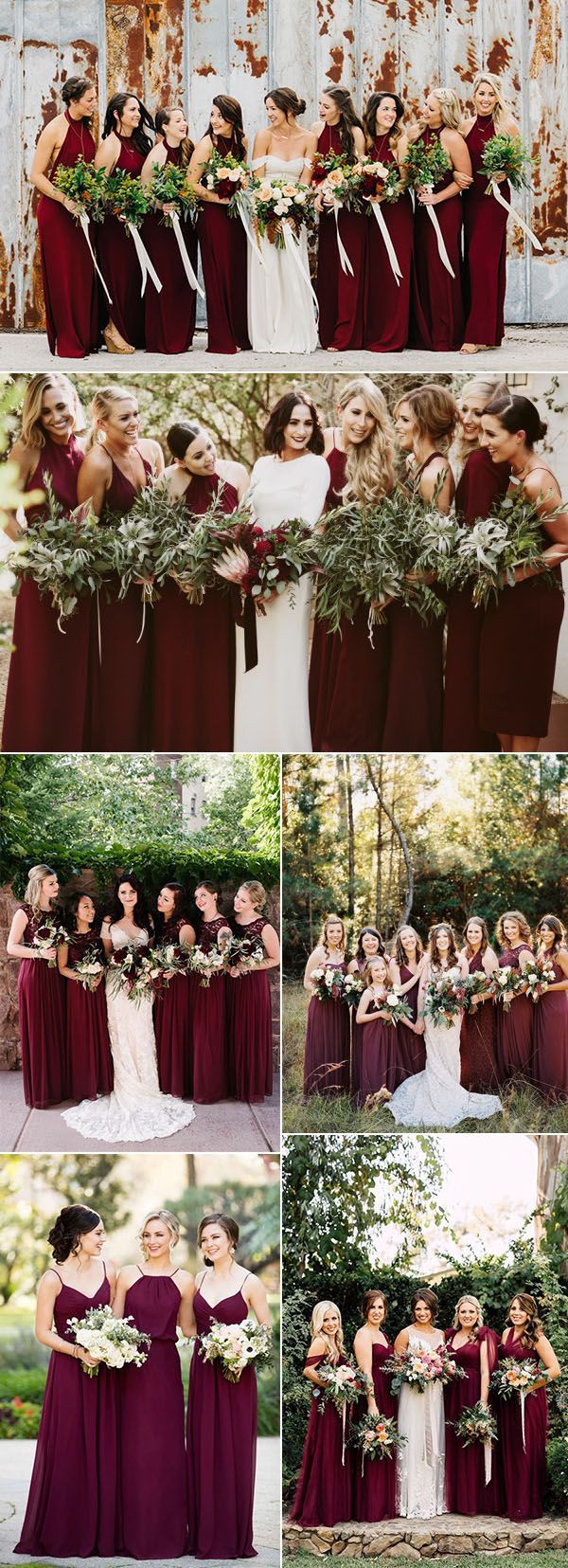 Дружки. Якщо в тебе буде кілька подружок, ти можеш їх одягнути в сукні бордового кольору — вони чудово будуть виглядати на фоні твоєї білосніжної весільної сукні. Особливо стильними будуть сукні із оксамиту. Також можеш розглянути варіант довгої сукні з топом — стильний і практичний варіант.