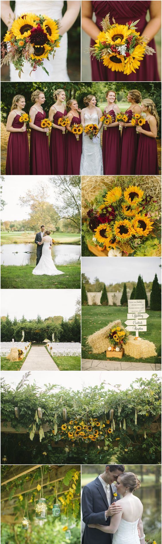 А подивись, як бордовий красиво поєднується з соняшниками — чудовий варіант для весілля в кінці літа або на початку осені: