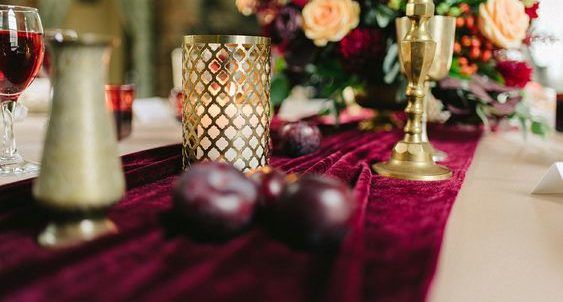 Дуже стильно будуть виглядати бордові високі свічки, а також текстиль із оксамиту (наприклад, столова доріжка).