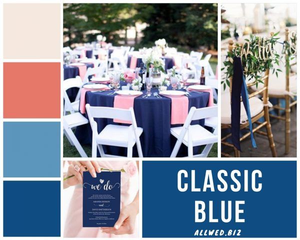 Стоит также отметить, что Classic Blue чудесно подходит для оформления свадьбы в любое время года. Весной он чудесно будет смотреться на фоне свежей зелени и цветов, летом — подарит ощущение прохлады, осенью — великолепно подчеркнет желто-оранжевый цвет листвы, а зимой будет блистать (для зимней свадьбы блестки в синем цвете — это шикарное решение).