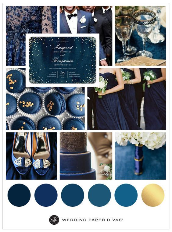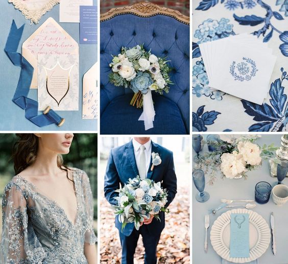 Классический синий очень хорошо сочетается с другими оттенками. Самая простая и сдержанная палитра, которая идеально подойдет для классического стиля свадьбы — это оттенки синего и пыльно-голубого.