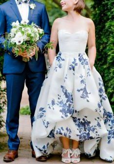 Конечно же, подчеркнуть цвет свадьбы можно и с помощью одежды и аксессуаров. Синие и голубые цветы на свадебном платье (а смелые невесты могут выбрать и цветное свадебное платье в 2020 году), туфли и другие аксессуары у невесты сделают ее образ оригинальным и сделают акцент на стиле свадьбы.