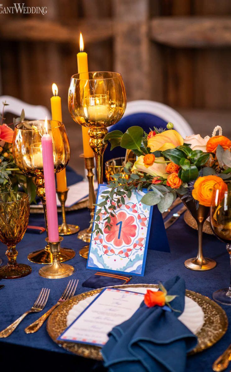Информационные таблички (номерки столов, схема рассадки, welcome) и полиграфия (пригласительные, рассадочные карточки, меню и др.) тоже можно выполнить в цвете свадьбы — классическом синем.