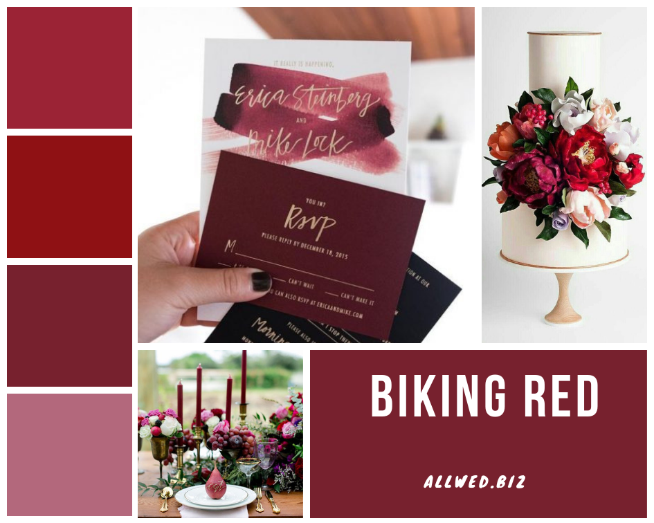 Biking Red (Красный велосипед). Глубокий темно-красный цвет точно станет одним из фаворитов этого свадебного сезона. Он будет очень хорошо сочетаться с винно-красными оттенками и розово-фиолетовым Mauve.