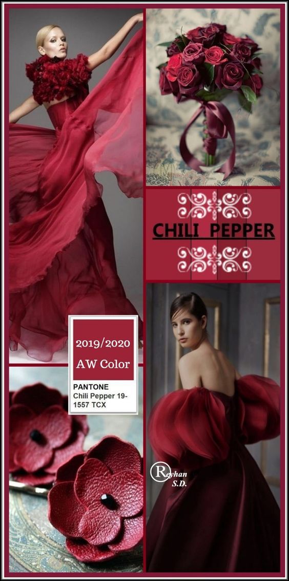 Перец чили (Chili Pepper). Пряный и согревающий оттенок, который идеально подойдет для свадьбы в холодное время года. Очень красивое сочетание получится с пыльно-синим цветом и оттенками красного и бордового.
