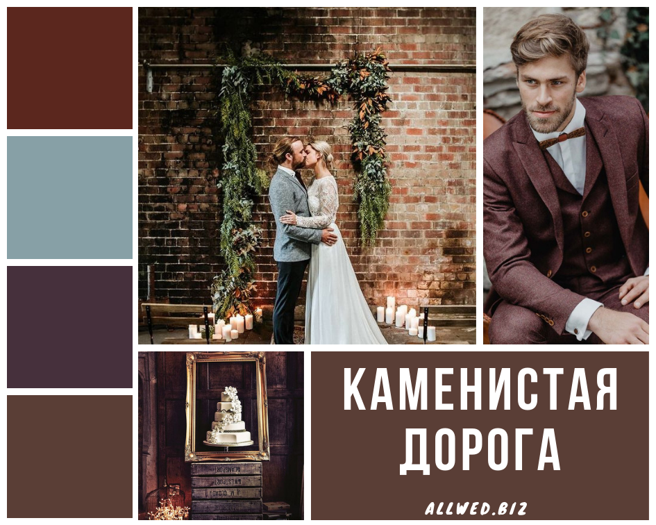 Темно-коричневый оттенок «Каменистая дорога» будет идеально смотреться в бархате. Прекрасный выбор для свадьбы в холодное время года.