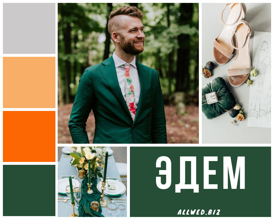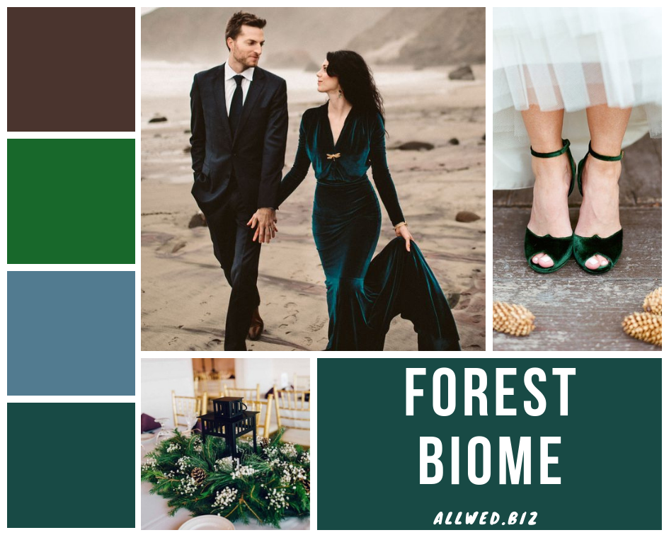 Forest Biome. Этот глубокий оттенок лесной зелени будет чудесно гармонировать с осенними яркими пейзажами и белоснежной зимой. Он прекрасно впишется в любую стилистику — от классики до индустриальной свадьбы.