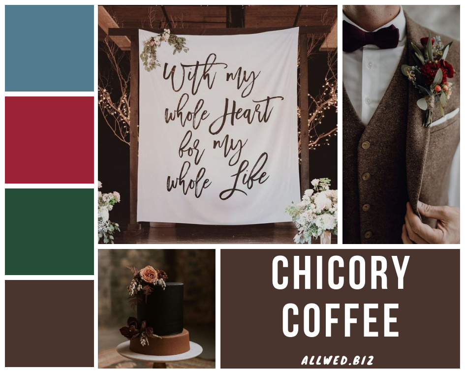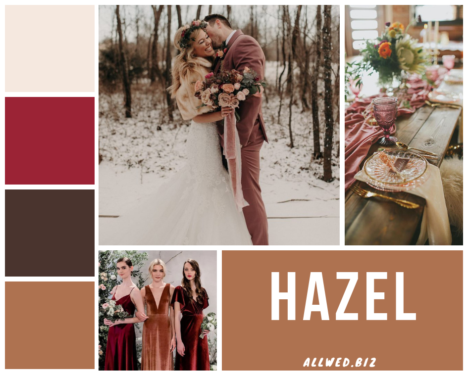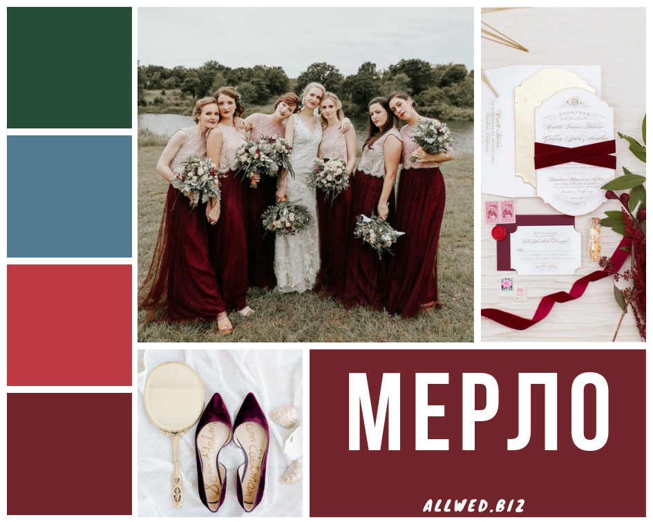 Мерло (Merlot). В осенне-зимней палитре от Pantone практически всегда присутствует оттенок бордового. И этот сезон — не исключение. После нескольких лет огромной популярности Марсалы многие невесты совсем хотят отказаться от бордового. Хотя это самый беспроигрышный цвет для осенней свадьбы. Поэтому в этом сезоне советуем тебе присмотреться к красно-коричневому оттенку вина Мерло.