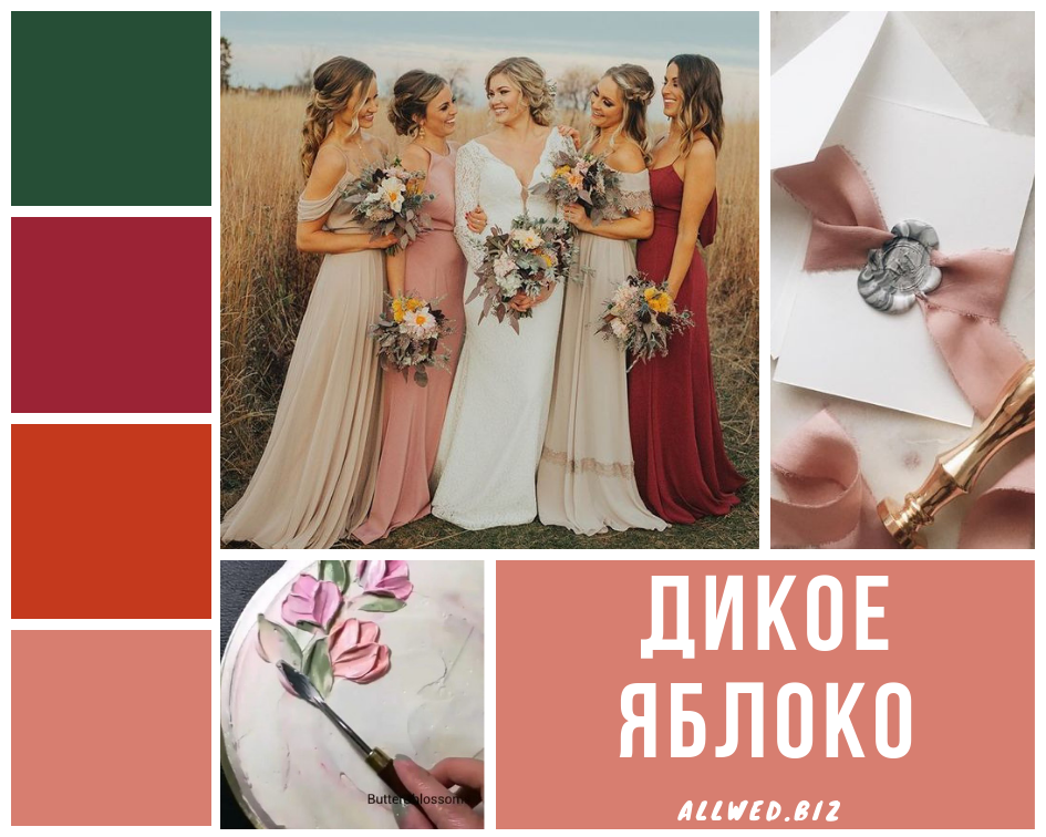 Дикое яблоко (Crabapple). Этот оттенок напоминает подрумянившийся на солнце бочок дикого яблока. Чудесно подойдет для свадьбы в стиле Fine Art.