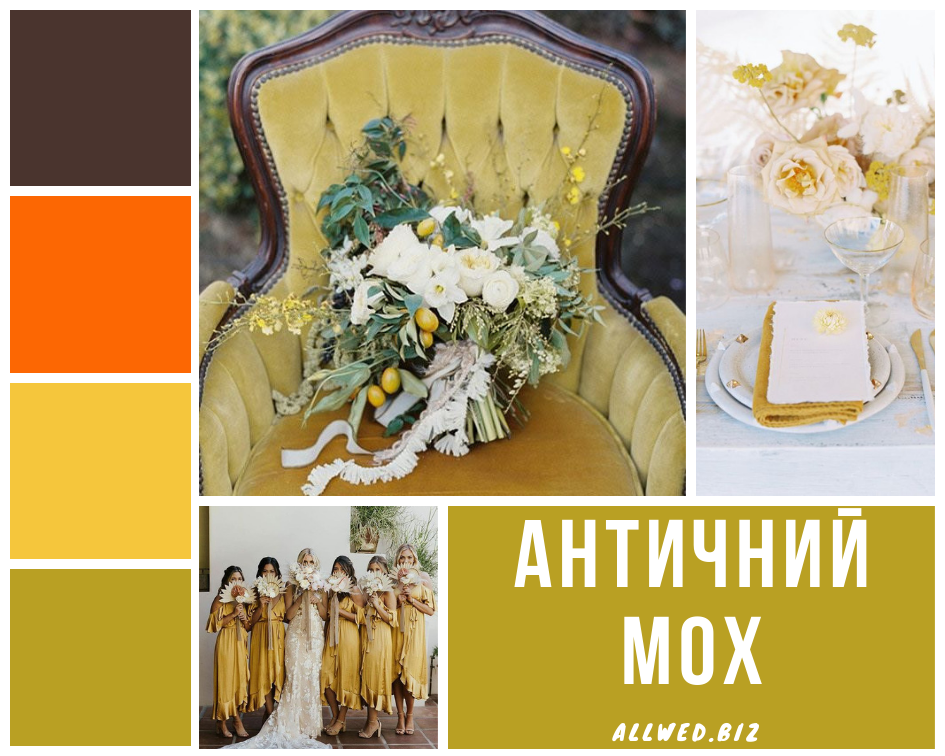Античный мох (Antique Moss). Желто-зеленый цвет увядающей листвы. Он чудесно впишется в любую осеннюю палитру свадьбы.
