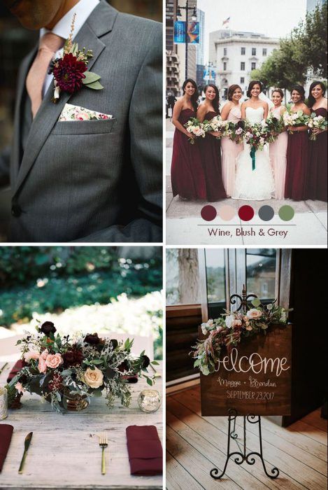 Эта цветовая комбинация смотрится выигрышно в любое время года. Розовый цвет румян выгодно подчеркивает эффектность винного оттенка, а темно-серый гармонично вписывается в красно-розовую идиллию. Зелень в цветочных композициях добавит этой палитре роскошь.