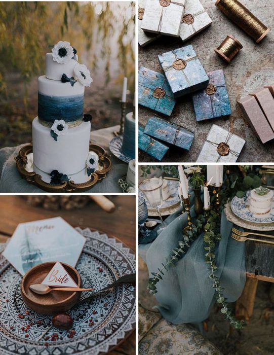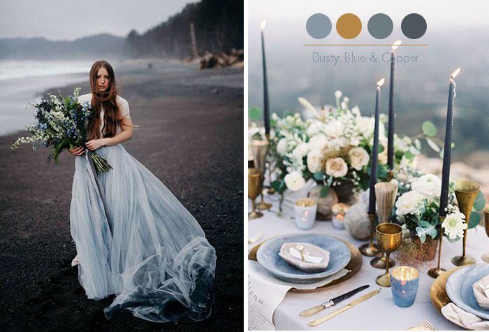 Медь придает эффект благородства и старины. Она хорошо сочетается с пыльно-синим оттенком, потому что ее блеск лишь подчеркивает, а не затмевает его.