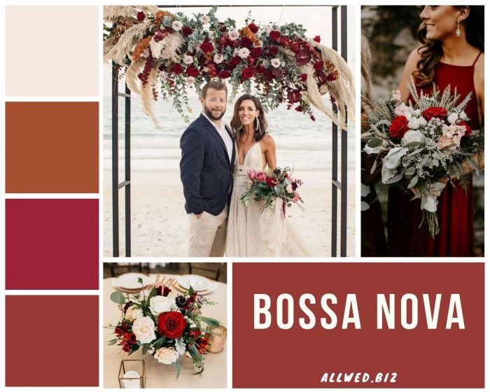 Bossa Nova (Босса Нова). Этот темно-красный цвет с коричневым подтоном лучше всего подойдет для свадьбы в конце лета. Благородный и элегантный оттенок станет отличной альтернативой алому красному и бордовому.