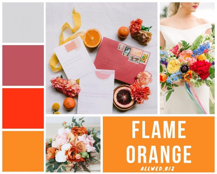 В этом свадебном сезоне лучше всего этот оттенок оранжевого будет сочетаться с коралловым цветом. Такой дуэт получается очень нежным и изящным. А если хочешь ярких красок, то смело сочетай Flame Orange с Fiery Red.