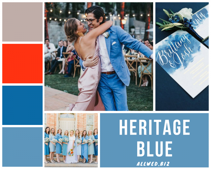 Heritage Blue. Классический оттенок голубого как нельзя кстати будет выглядеть на весенней и летней свадьбе. При чем его можно использовать не только в декоре, но и даже в образе жениха. Яркие мужские костюмы будут на пике популярности в этом свадебном сезоне — бери на заметку эту информацию.
