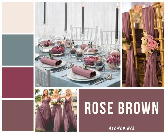 Rose Brown (Розовый коричневый). Этот оттенок очень похож на Mauve, который был популярен в прошлом сезоне. Смотрится красиво в любое время года и в любых сочетаниях. Благородный, изысканный и глубокий — он украсит свадьбу в любом стиле.
