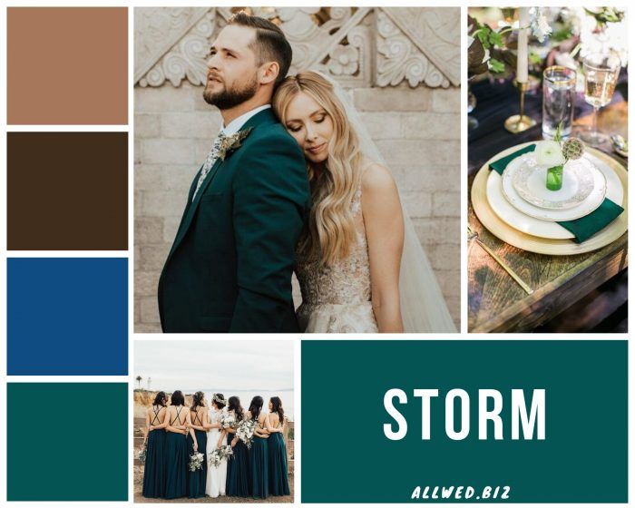 Storm (Шторм). Этот глубокий сине-зеленый оттенок лучше всего подойдет для свадьбы в начале весны или в конце лета. Если хочешь спокойной палитры — сочетай его с пастельными, земляными оттенками коричневого.