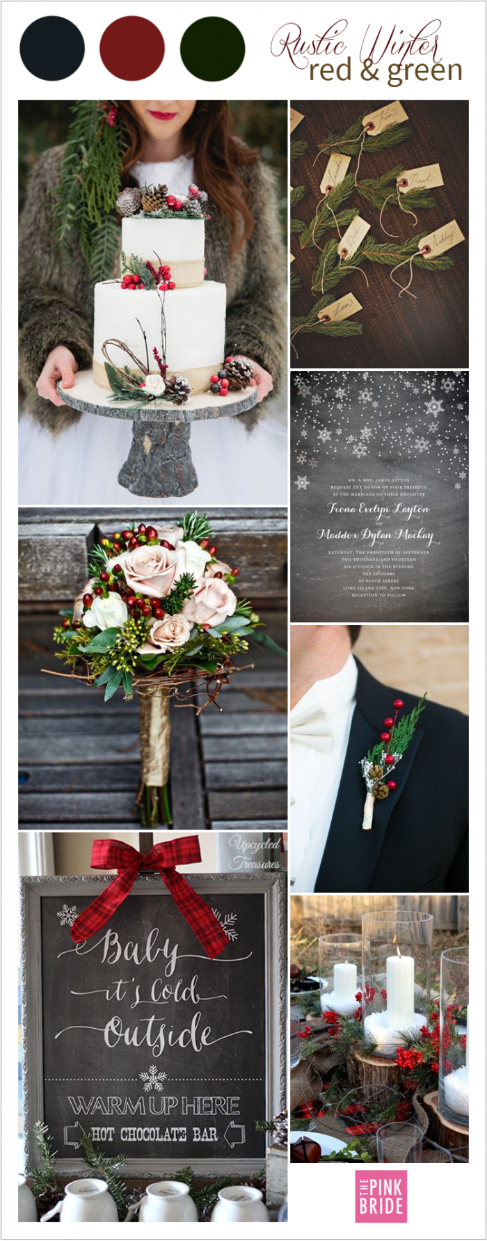 Зеленый и красный. Еще одна цветовая палитра для рустикальной свадьбы. Простая и в то же время очень нарядная и прекрасно скрасит даже самый унылый зимний пейзаж. А если вам повезет со снежной погодой, то зеленый и красный цвет будут невероятно красиво смотреться на фоне белоснежного цвета.