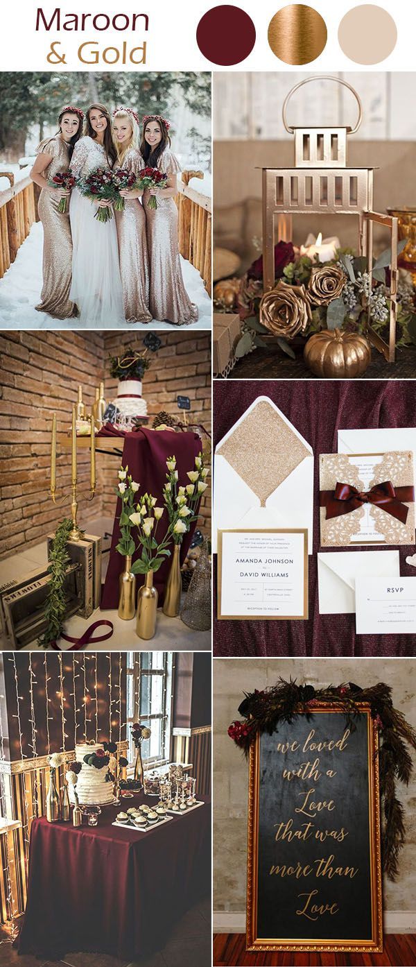 Бордовый и золото. Уже не первый сезон различные оттенки бордового на пике популярности. Для зимней свадебной церемонии вы можете выбрать очень изящное сочетание винного и золотого цвета.