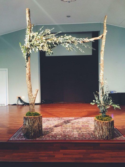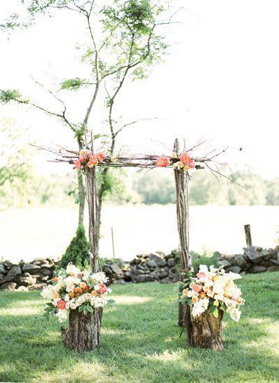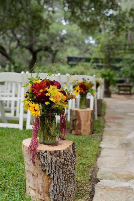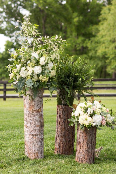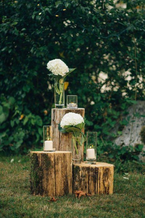 Большие деревянные пни или несколько пней разного размера могут отлично дополнить свадебную арку (или даже стать ее частью) и зону церемонии.