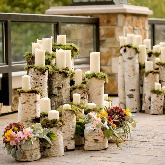 Деревянные пни также отлично сочетаются со свечами, добавляя уюта церемонии. Главное — соблюдать правила пожарной безопасности.
