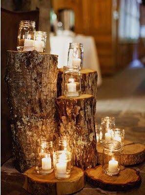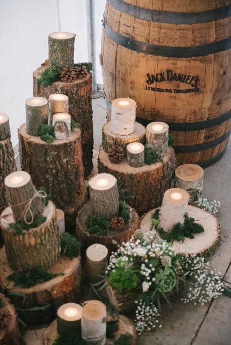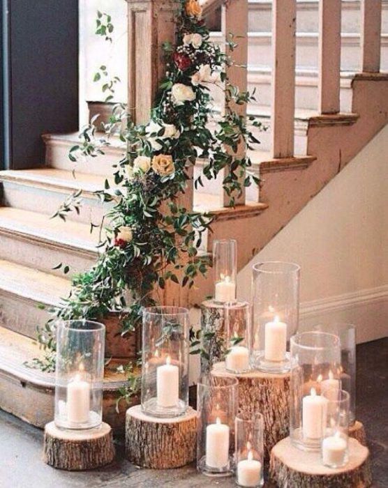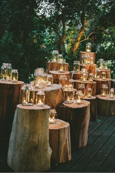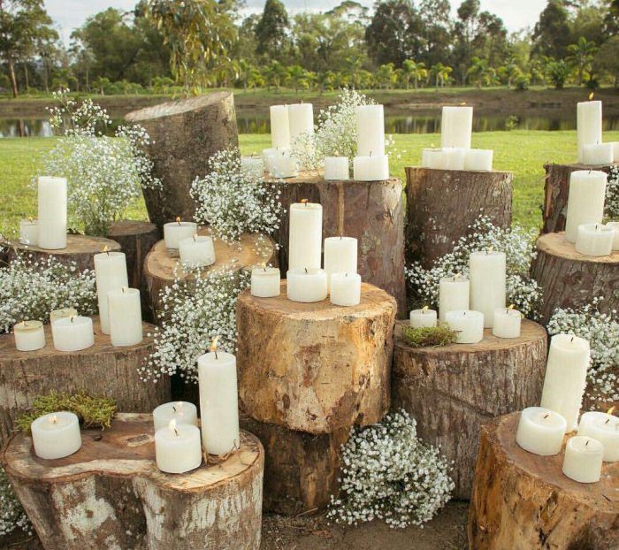 Деревянные пни также отлично сочетаются со свечами, добавляя уюта церемонии. Главное — соблюдать правила пожарной безопасности.