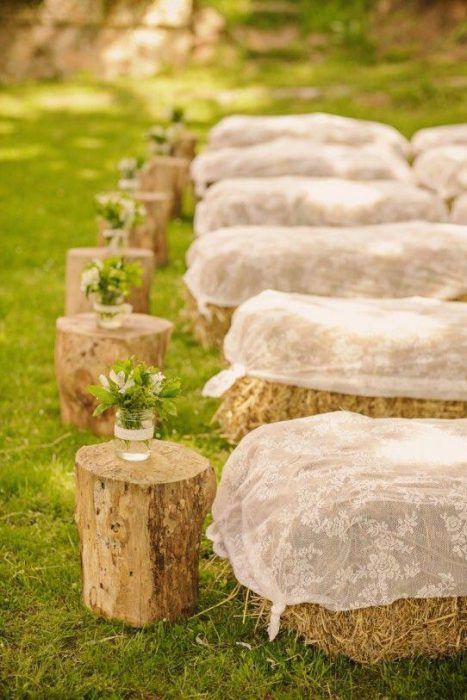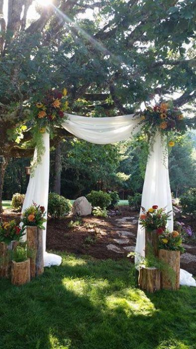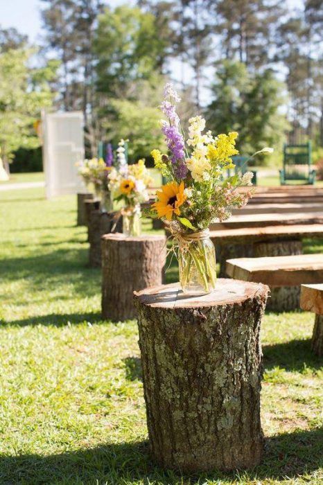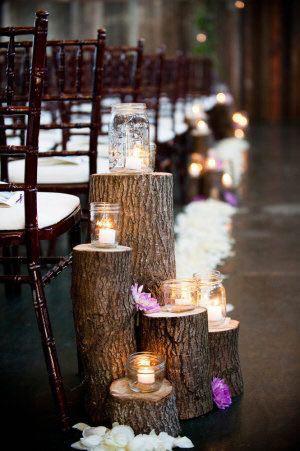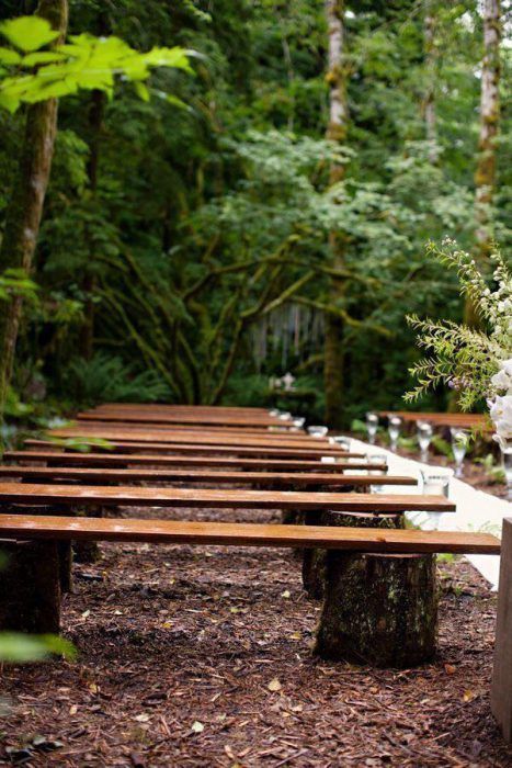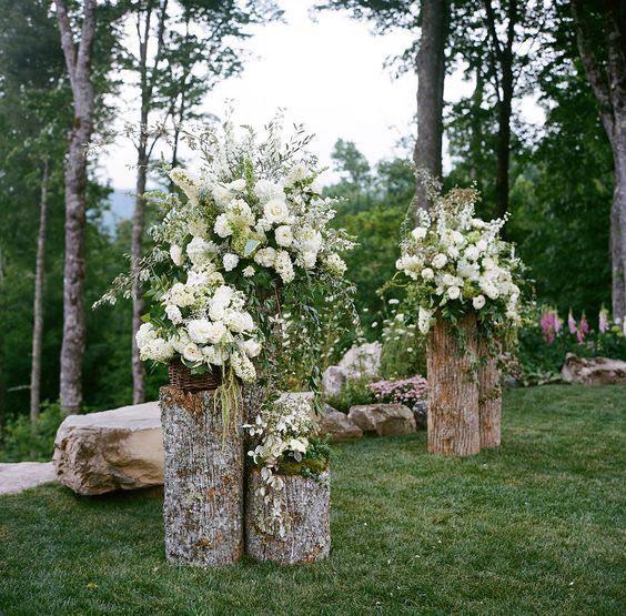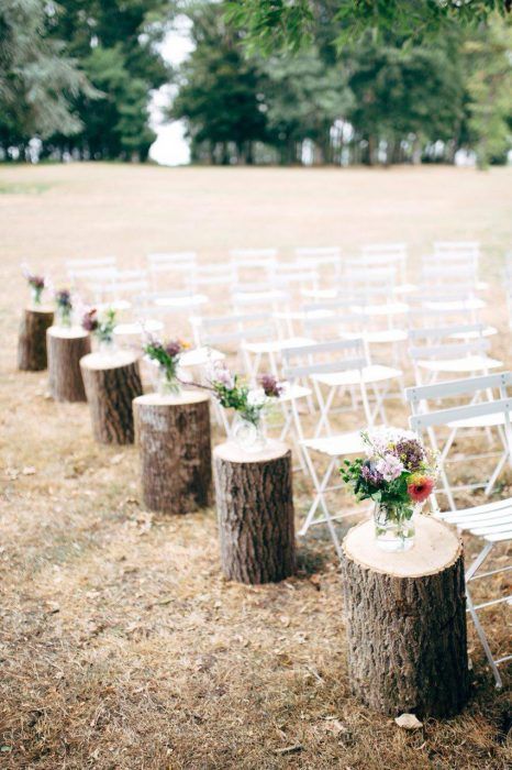 Большие деревянные пни или несколько пней разного размера могут отлично дополнить свадебную арку (или даже стать ее частью) и зону церемонии.