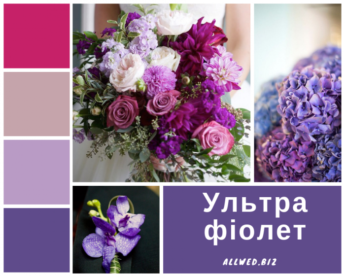 Ультрафіолет (Ultra Violet). Насичений і глибокий відтінок фіолетового, який розкішно виглядає в декорі весілля. Як і з чим його поєднувати — читай в нашій статті «Колір весілля: ультрафіолет»