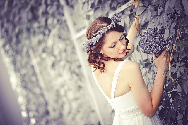 Оригінально виглядають гілочки лаванди в зачісці. Не менш чудовий варіант із лавандовим вінком.