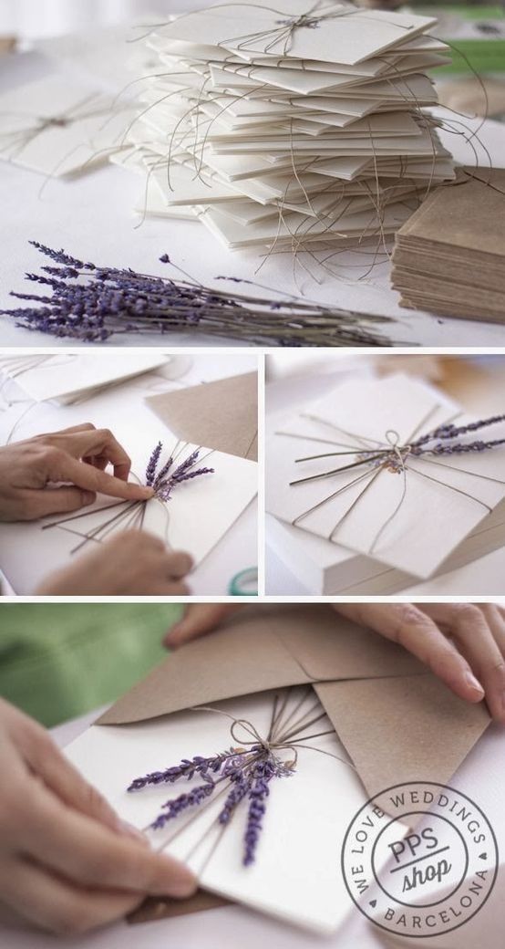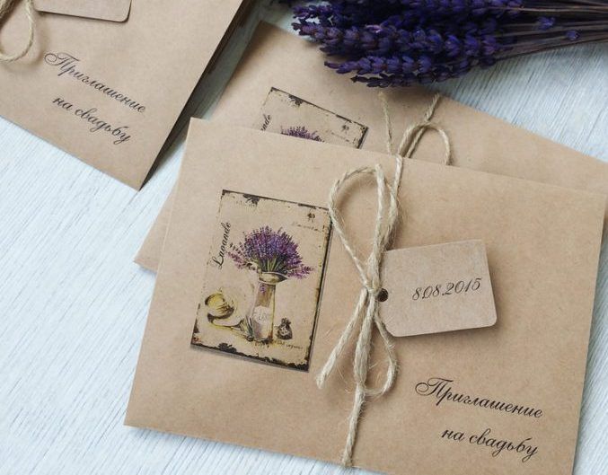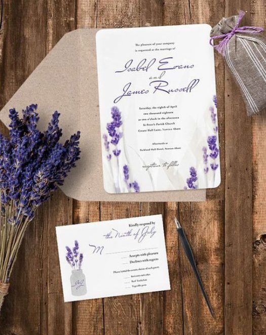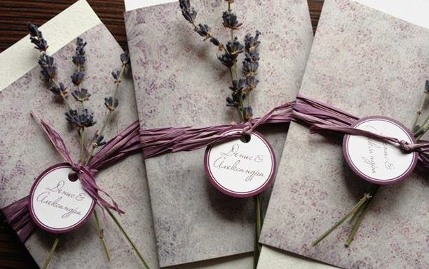 Запрошення на весілля в лавандовому кольорі можуть бути класичними, без зайвих деталей. Також дуже ніжно виглядають акварельні запрошення, а лазерна різка привертає увагу своєю філігранністю.