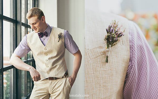 Костюм нареченого можна доповнити бутоньєркою з гілочок лаванди, а можна привернути увагу кольоровим метеликом або краваткою, експериментувати з кольорами сорочки та всього костюма в цілому. Як бачите, в образі нареченого теж є місце для польоту фантазії!