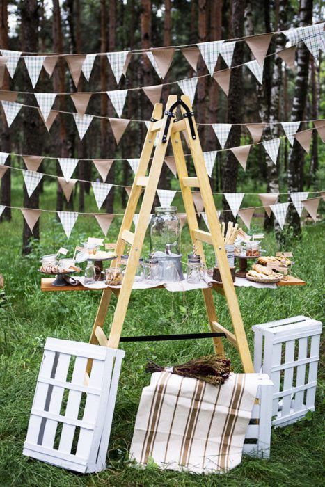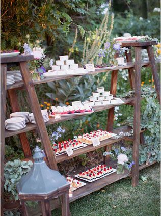 Оригинально разместить угощения для гостей тоже можно при помощи лестницы. Получится весьма аппетитная горка!