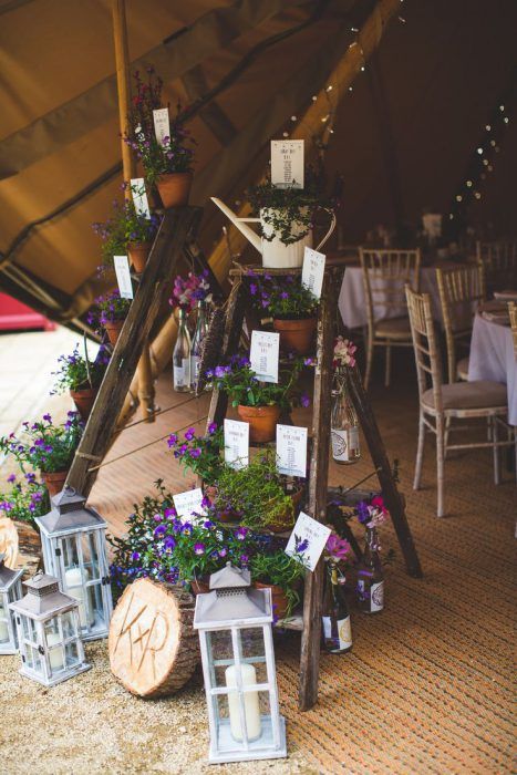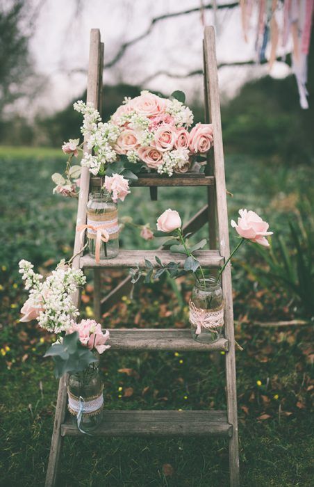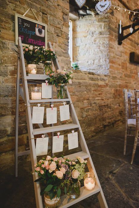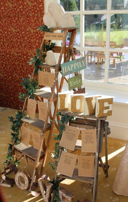 Если ваша свадьба планируется в стиле шебби-шик или эко стиле, деревянная лестница-стремянка может выполнить роль карты рассадки или указателей различных зон проведения торжества.