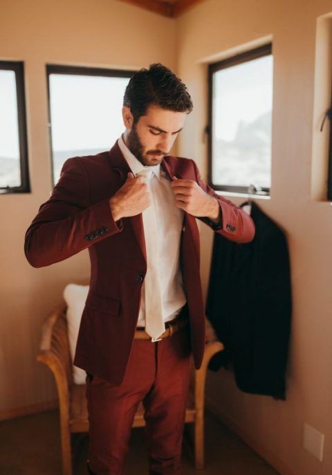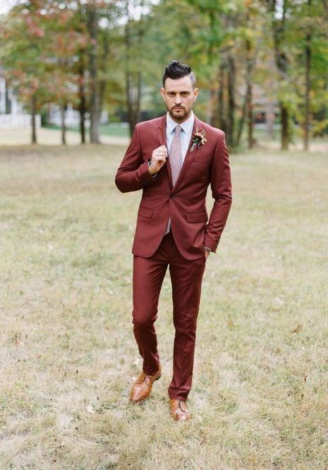 В холодное время года отлично будет смотреться бордовый костюм.