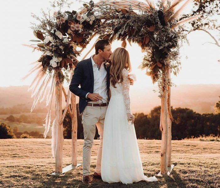 Свадебная арка с пампасной травой выглядит воздушной, легкой и пушистой. Она поддается дуновению ветра и будто оживает, лучи солнца путаются в ее мягких сплетениях — все это создает невероятно романтическую атмосферу.