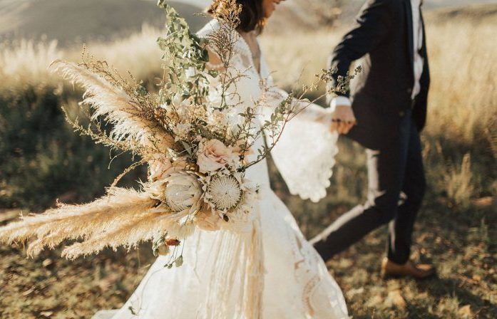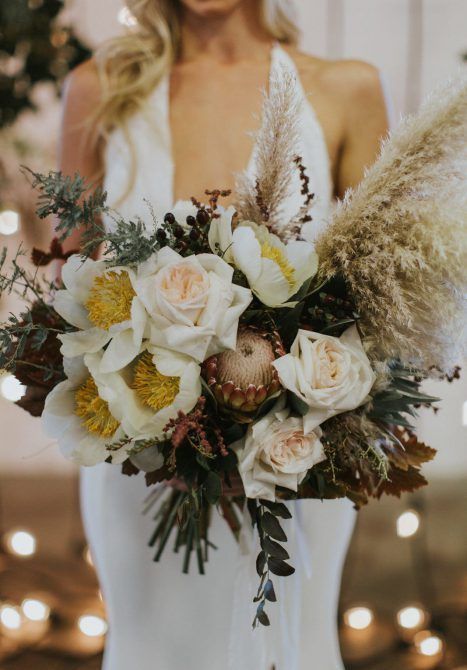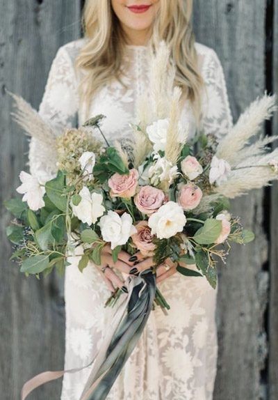Если вы решили использовать пампас в декоре своей свадьбы, то непременно добавьте его в свой букет. Пампасная трава объемная, поэтому лучше выбирайте каскадную форму. Несомненный плюс пампаса — он прекрасен как на летней, так и на зимней свадьбе!