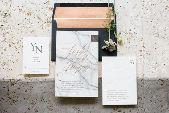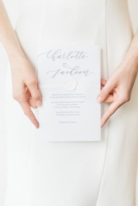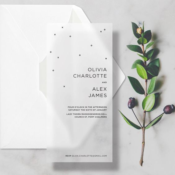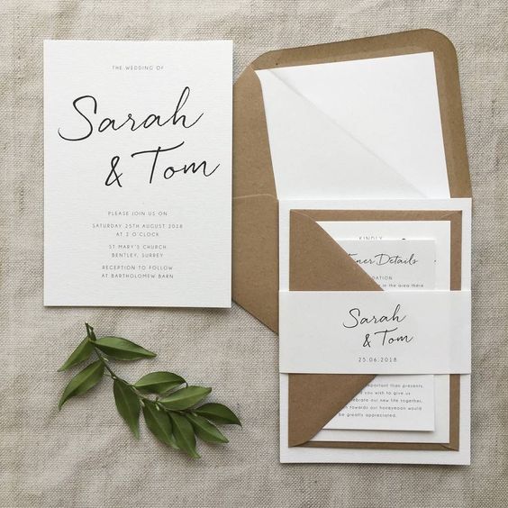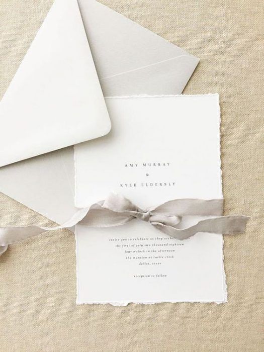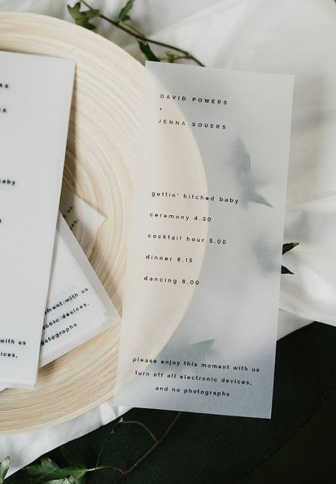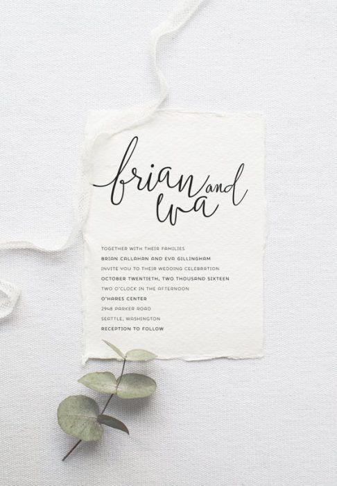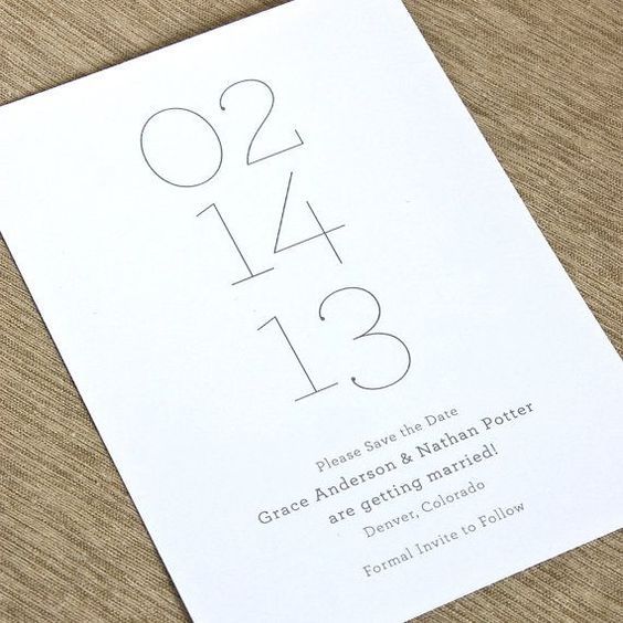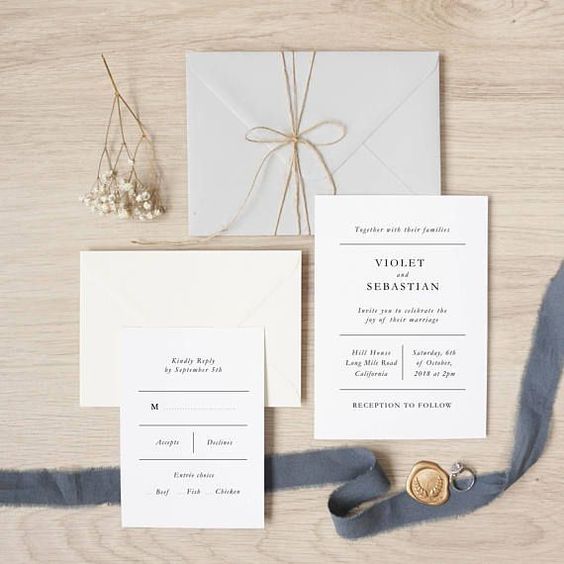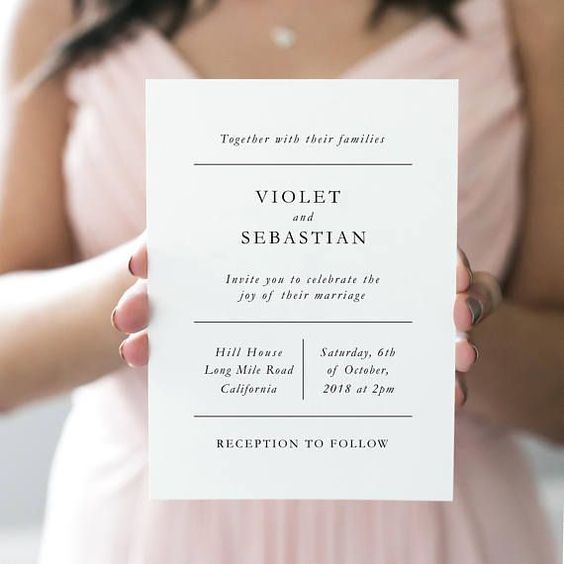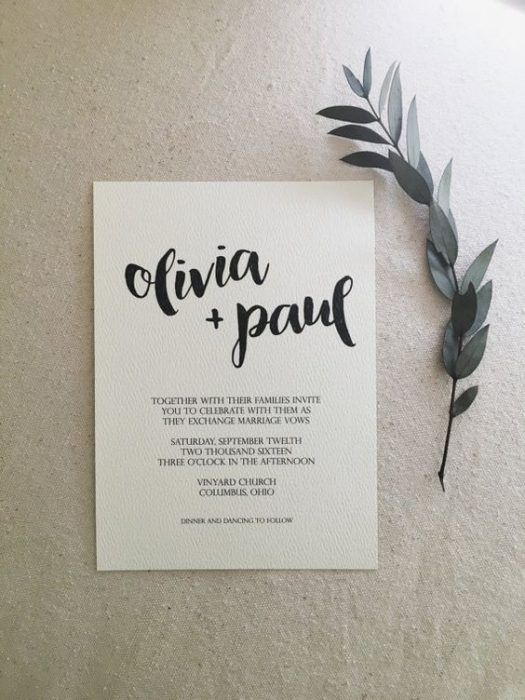 Свадебные приглашения в стиле минимализм просты и незамысловаты — белый фон и черный шрифт. Здесь вы не увидите изящных узоров или особенной отделки.