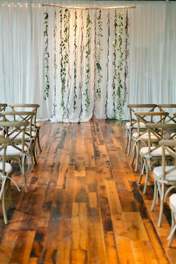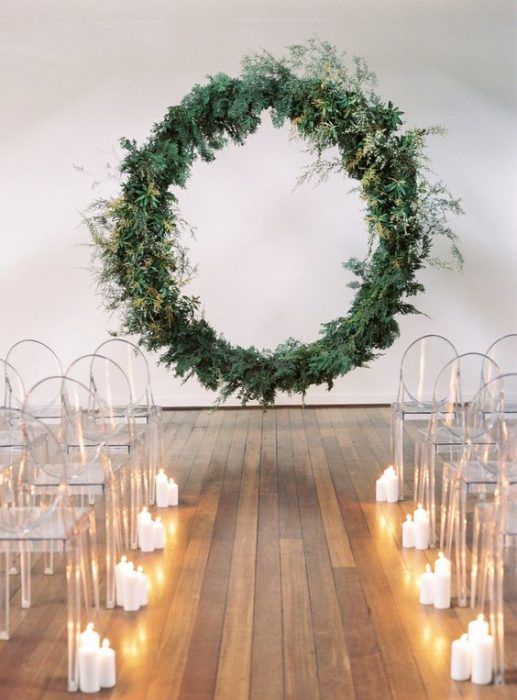 А теперь давайте рассмотрим на конкретных примерах, как эти черты минимализма применить в свадебном оформлении. Начнем с места церемонии. Свадебная арка очень простая или вообще отсутствует как таковая. Металл, зелень или просто обозначенное место для церемонии с минимум декора — это все свадебная церемония в стиле минимализм.