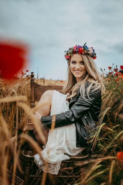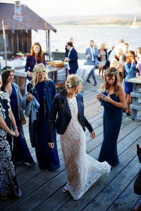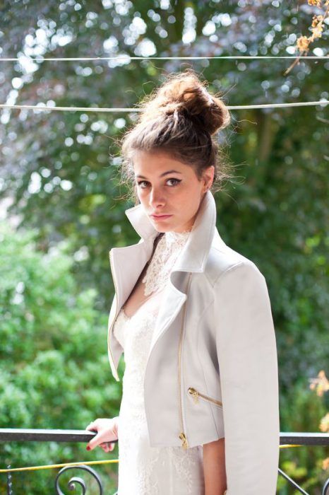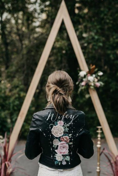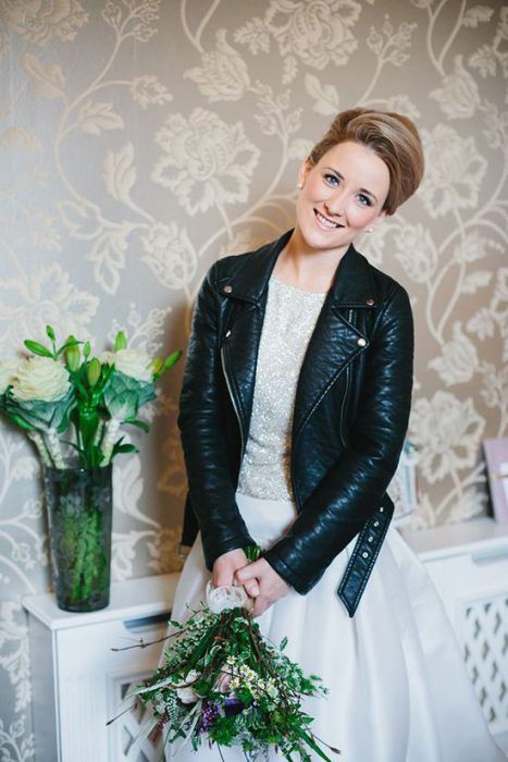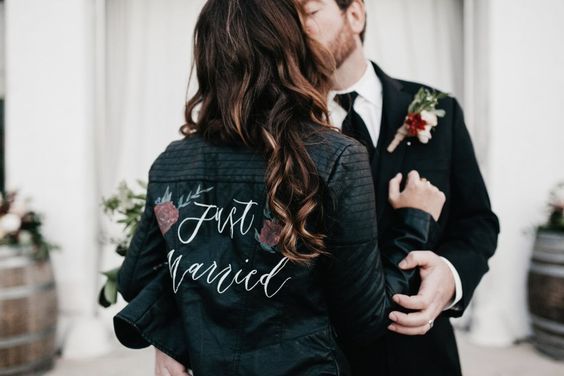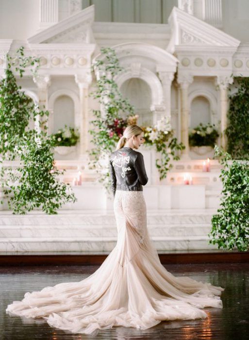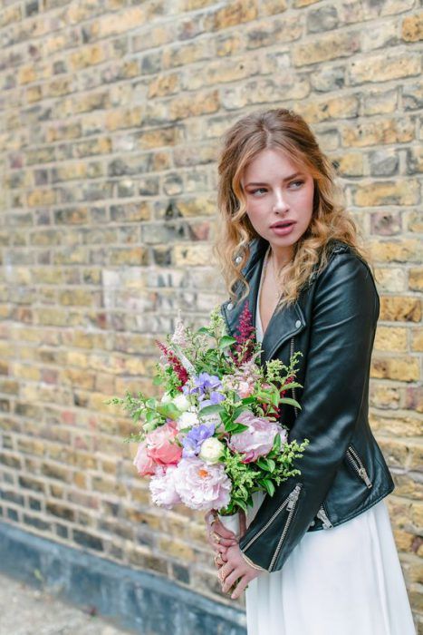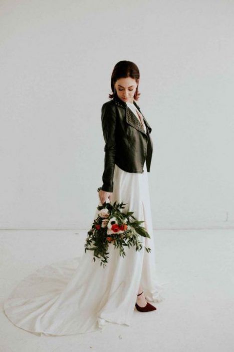 Идеальным стилем свадьбы для образа невесты с кожаной курточкой будет индустриальный стиль или минимализм.