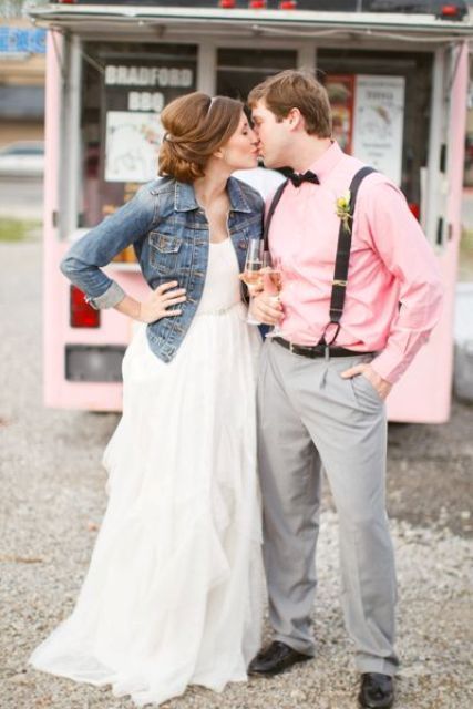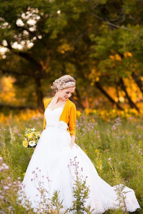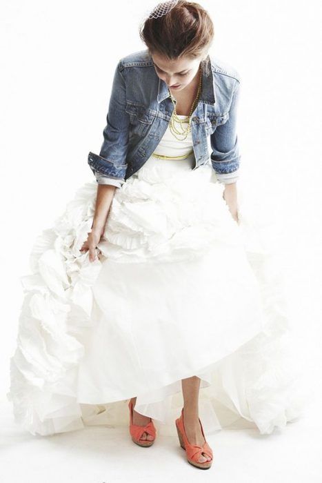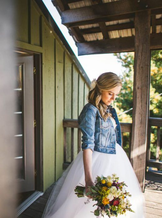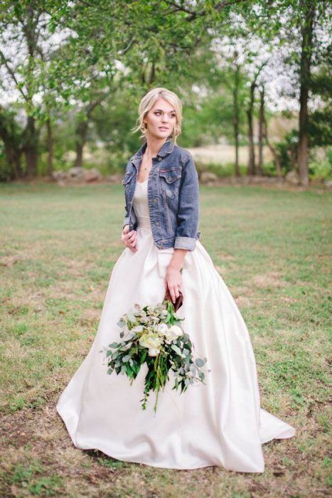 Еще один вариант согреться прохладным осенним днем или вечером — накинуть на плечи джинсовую курточку или рубашку. Такой образ невесты идеально впишется в торжество в стиле рустик или кантри. А вот для классики лучше подобрать что-то другое.