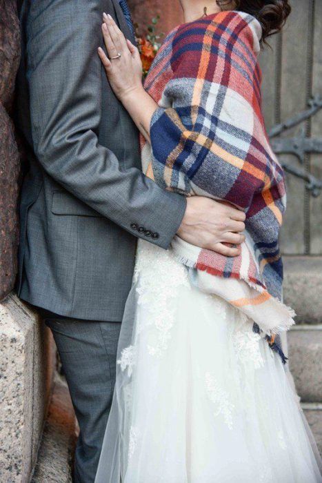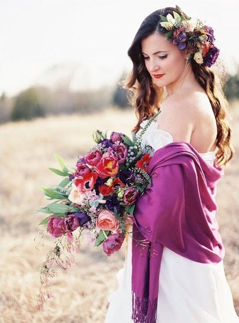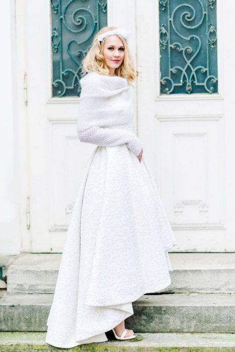 Согреться и дополнить твой образ невесты помогут также шарф, шаль или палантин. В зависимости от стиля свадьбы и твоих предпочтений ты можешь выбрать изящную шаль или вязанную накидку.