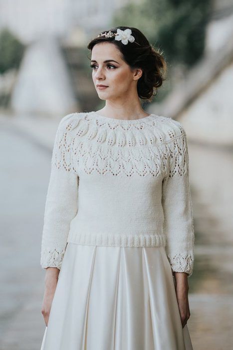 Свитер смотрится довольно необычно в сочетании со свадебным платьем и позволяет создать более демократичный образ невесты.