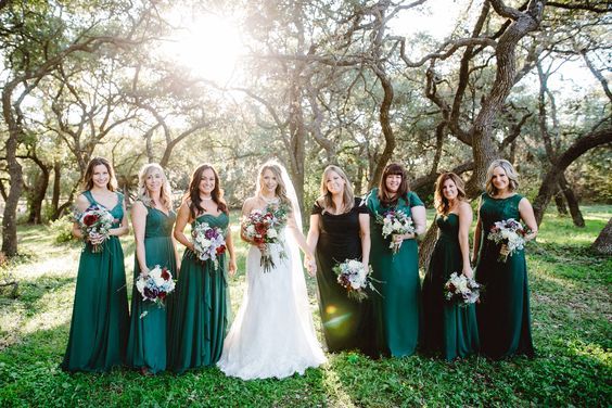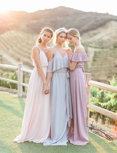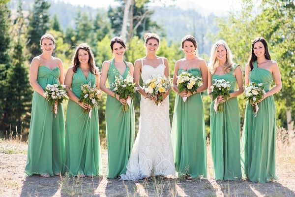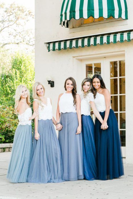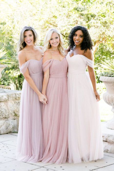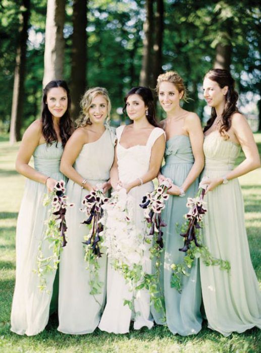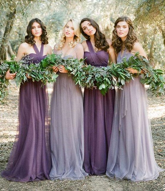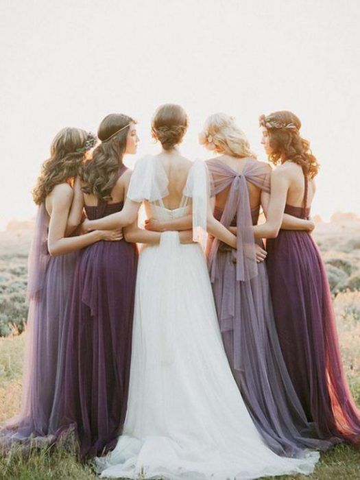 Проявить индивидуальность каждой подружки и создать эффект «омбре» (перехода от более светлого оттенка к темному) можно с помощью платьев разных оттенков.