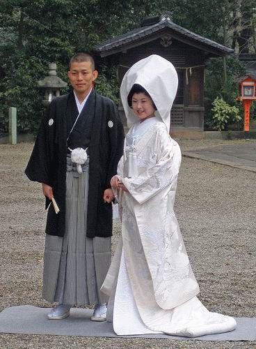 Невеста надевает белоснежное многослойное кимоно и сиромуку –головной убор в виде объемного парика. Он покрыт сложной вышивкой и блистает от бусин и украшений. Под сиромуку девушка прячет «рожки ревности», поскольку японцы полагают, что это чувство есть у любой представительницы слабого пола. Белый цвет в Японии не только означает чистоту, но и смерть – так невеста умирает для своего рода и воскресает в роду мужа. Соответственно, после церемонии невеста облачается в красное или цветное кимоно – символ богатой и счастливой жизни.